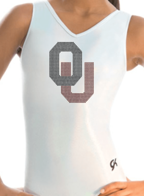 This shimmering white Oklahoma girls’ gymnastics leotard is a guaranteed attention-getter!